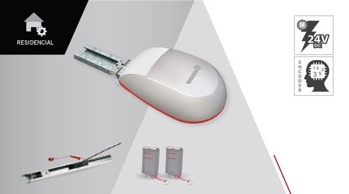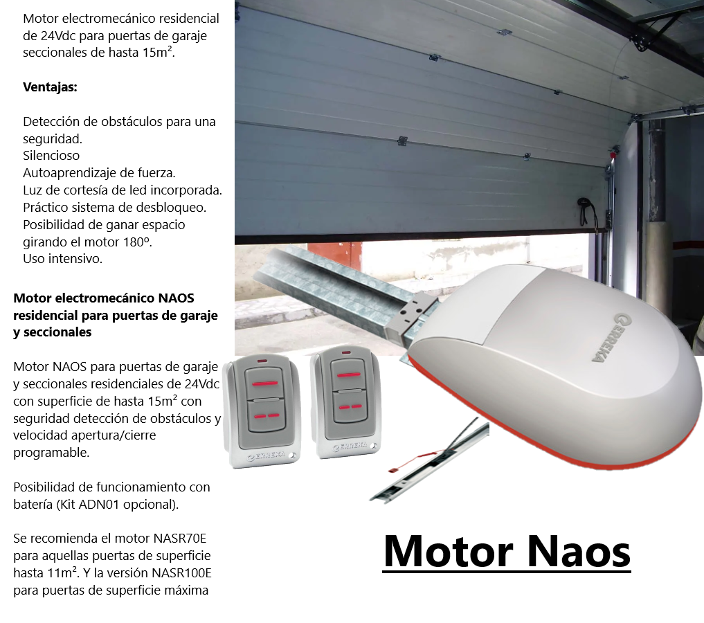 Motor NAOS para puertas de garaje y seccionales residenciales de 24Vdc con superficie de hasta 15m² con seguridad detección de obstáculos y velocidad apertura/cierre programable.